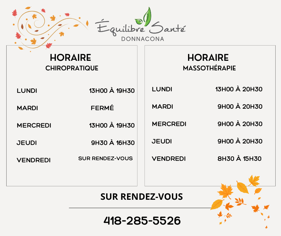 Équilibre Santé Donnacona, c’est une équipe professionnelle spécialisée dans les domaines de la chiropratique, de la massothérapie et du yoga. Notre but est d’améliorer votre qualité de vie globale en vous offrant des soins adaptés à votre condition dans un espace de détente et de respect.